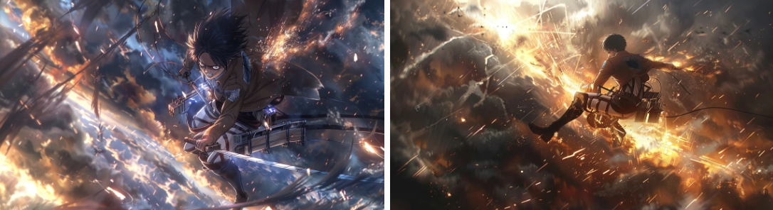 리바이의 전투 장면은 『진격의 거인』의 백미라 할 수 있다. 거대한 거인을 향해 몸을 던지고, 입체기동 장비로 공중을 가르며 칼날을 꽂아 넣는 장면은 팬들에게 강렬한 쾌감을 선사했다. 특히 짧고 날카로운 움직임으로 단번에 거인을 제압하는 모습은 그야말로 ‘예술적인 전투’에 가까웠다.