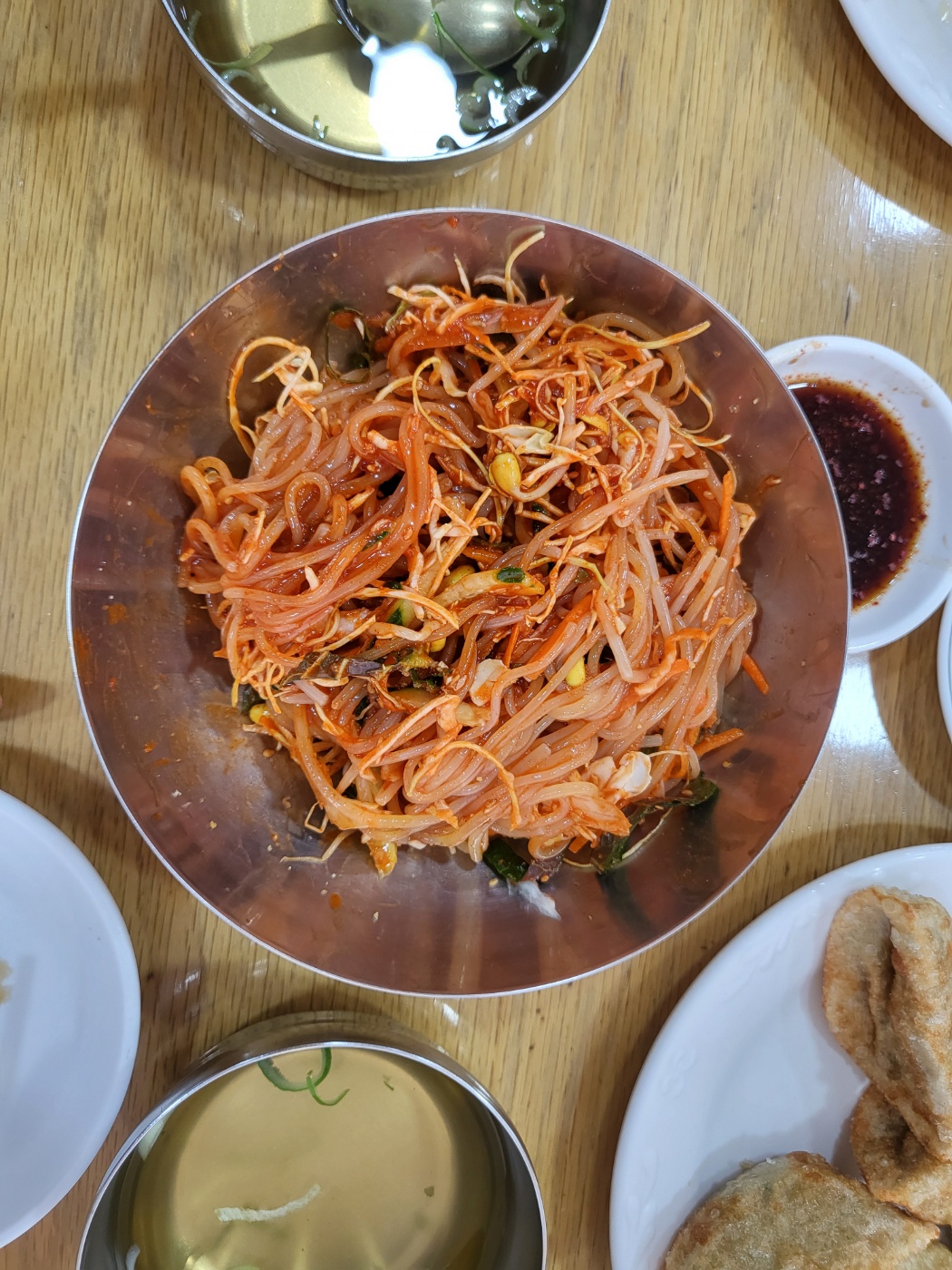 오늘은 군만두 2인분, 쫄면 2인분을 주문했어요. 명승원의 쫄면은 양념이 강하지 않으면서도 깊은 맛이 있고, 함께 나오는 국물이 정말 독특해요. 일반적인 멸치육수가 아니라, 콩나물 향이 나는 맑은 국물인데, 비린 맛 없이 깔끔하니 입맛을 살려준답니다. 남편은 평소 쫄면을 그리 좋아하지 않는데, 명승원 쫄면은 가끔 생각날 만큼 입에 잘 맞는다고 해요.