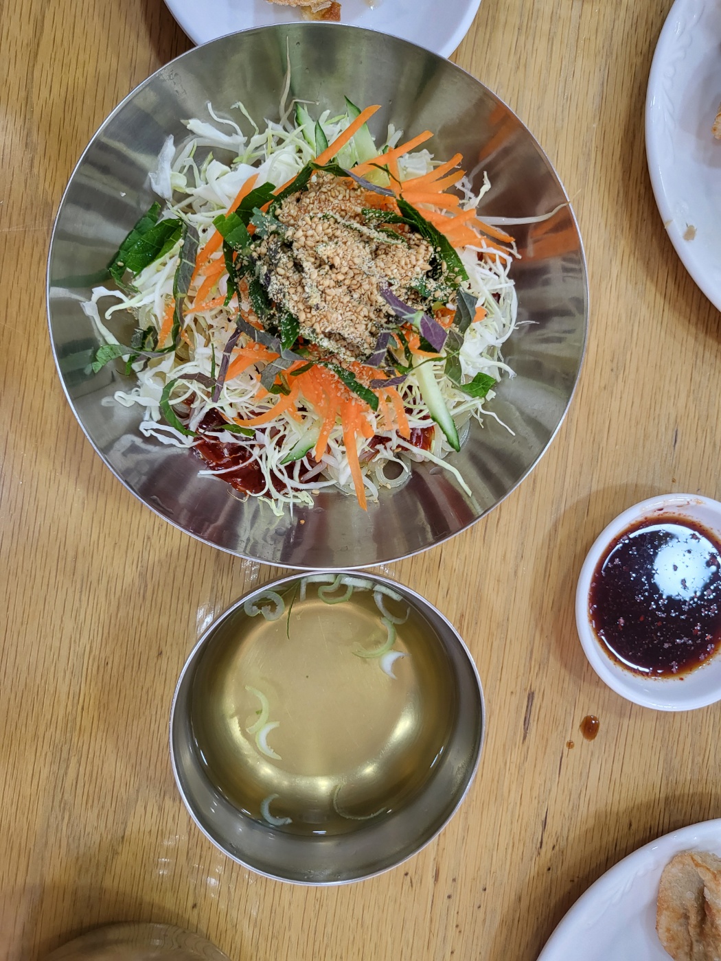 오늘은 군만두 2인분, 쫄면 2인분을 주문했어요. 명승원의 쫄면은 양념이 강하지 않으면서도 깊은 맛이 있고, 함께 나오는 국물이 정말 독특해요. 일반적인 멸치육수가 아니라, 콩나물 향이 나는 맑은 국물인데, 비린 맛 없이 깔끔하니 입맛을 살려준답니다. 남편은 평소 쫄면을 그리 좋아하지 않는데, 명승원 쫄면은 가끔 생각날 만큼 입에 잘 맞는다고 해요.