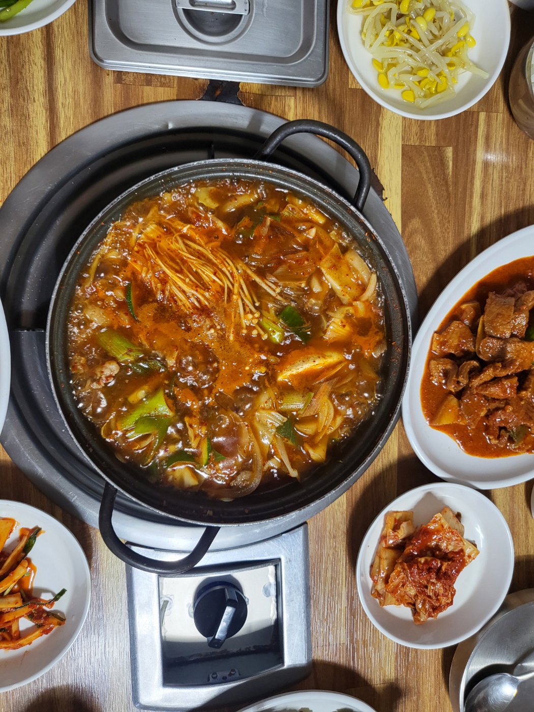 제 생각엔 화구가 하나뿐이라 소찌개를 끓이는 동안 두루치기는 완조리 상태로 나온 게 아닐까 싶었어요.